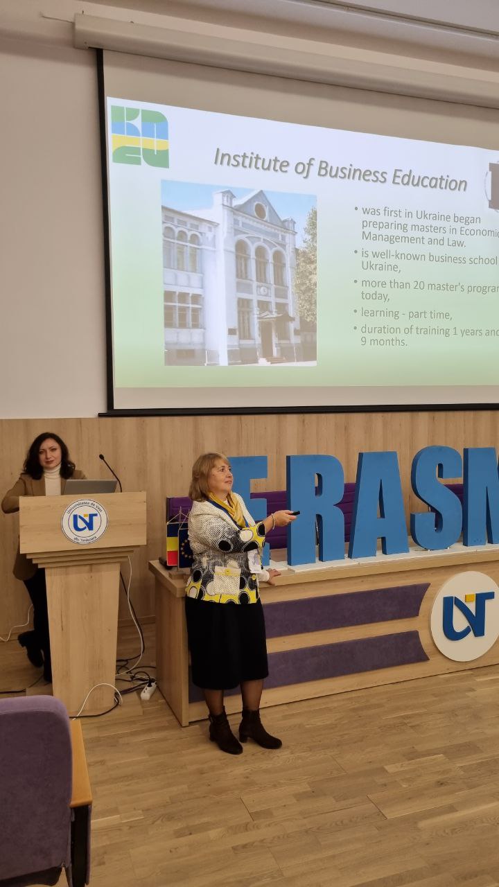 Викладачі кафедри професор Цимбал Л.І. та доцент Москалюк Н.П. пройшли стажування в Західному університеті Тімішоара, м.Тімішоара, Румунія, за участі в програмі академічної мобільності Еразмус+ «Інтернаціоналізація вищої освіти в 2022-2023 роках – фокус на Україну» на період з 24 по 28 жовтня 2022 року. Ключовими завданнями для стажування було вивчення європейського досвіду інтернаціоналізації вищої освіти; оволодіння інноваційними практиками організації роботи сучасного університету в кризових умовах та розробки освітньо-професійних програм «Бізнес-адміністрування» та «Міжнародна економіка»; презентація КНЕУ для подальшого нетворкінгу та пошуку партнерів для майбутньої співпраці; формування комунікаційних зв’язків у науковій та грантовій діяльності для залучення професорсько викладацького корпусу Західного університету Тімішоара до участі у кафедральному круглому столі «Механізми розбудови європейської зеленої економіки (березень 2023)».