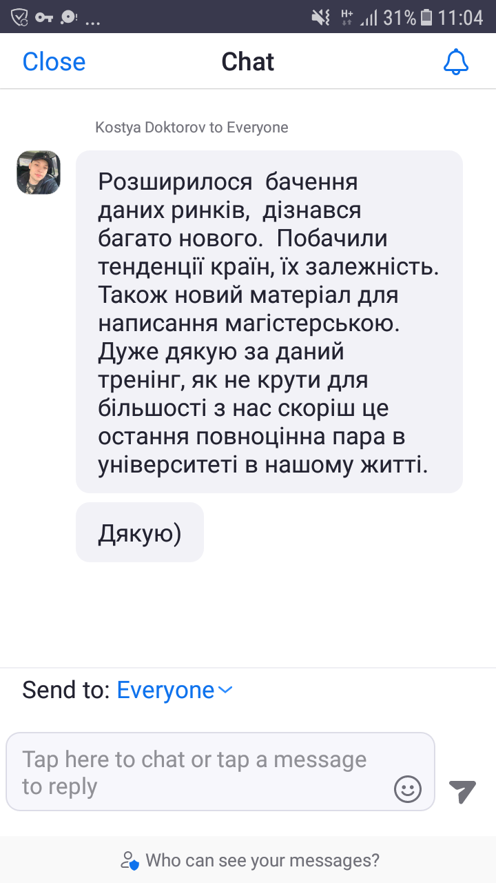 Feed back тренінгу отримав схвальні відгуки. Тренінг посилив компетентністно-фахові і практичні навички майбутніх магістрів в предметній області міжнародної економіки.