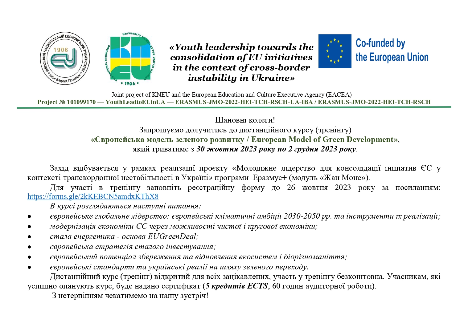 Розпочинається третій потік онлайн-тренінгу «Європейська модель зеленого розвитку»29 Жовтня 2023р.![]() Розпочинається третій потік онлайн-тренінгу «Європейська модель зеленого розвитку». Тренінг проводиться в рамках проекту міжнародної технічної допомоги Європейського Союзу Еразмус+ «Молодіжне лідерство для консолідації ініціатив ЄС у контексті транскордонної нестабільності в Україні»/"Youth leadership towards the consolidation of EU initiatives in the context of cross-border instability in Ukraine". Метою стратегії «Європейський зелений курс» є перетворення економіки на низьковуглецеву, стійку, а тому більш придатну для майбутніх поколінь. В умовах російської агресії та після того, як Україна отримала статус кандидата в члени ЄС, майбутнє України та Європи переосмислюється. Україні необхідно планувати повоєнне відновлення країни на засадах енергетичної незалежності та кліматичної безпеки і активізувати гармонізацію національного законодавства з європейським. У нас є унікальний шанс інтегруватися у нові виробничі ланцюги ЄС, що створюються для втілення Європейського зеленого курсу. Наші випускники будуть вивчати питання підвищення ефективності використання ресурсів, відновлення біорізноманіття та зменшення забруднення на практичних європейських кейсах, а також розробляти власні пропозицій впровадження трансформацій на принципах «зеленої» економіки для підприємств і організацій України. Реєстрація доступна за посиланням https://forms.gle/2kKEBCN5amdxKThX8 Переможемо та відбудуємо нашу країну! |