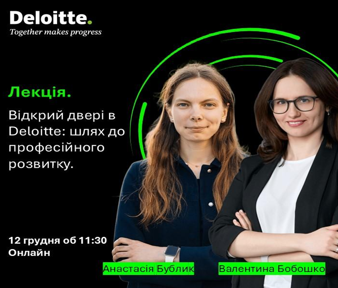 Відкрий двері в Deloitte: шлях до професійного розвитку11 Грудня 2025р.![]() «Відкрий двері в Deloitte: шлях до професійного розвитку». 12 грудня об 11.30 онлайн Хочеш дізнатися, як працює один із найвпливовіших аудиторсько-консалтингових бізнесів світу? Або зрозуміти, з чого починається кар’єра, що відкриває шлях до стрімкого професійного зростання? Запрошуємо тебе на лекцію «Відкрий двері в Deloitte: шлях до професійного розвитку». На зустрічі поговоримо про те: