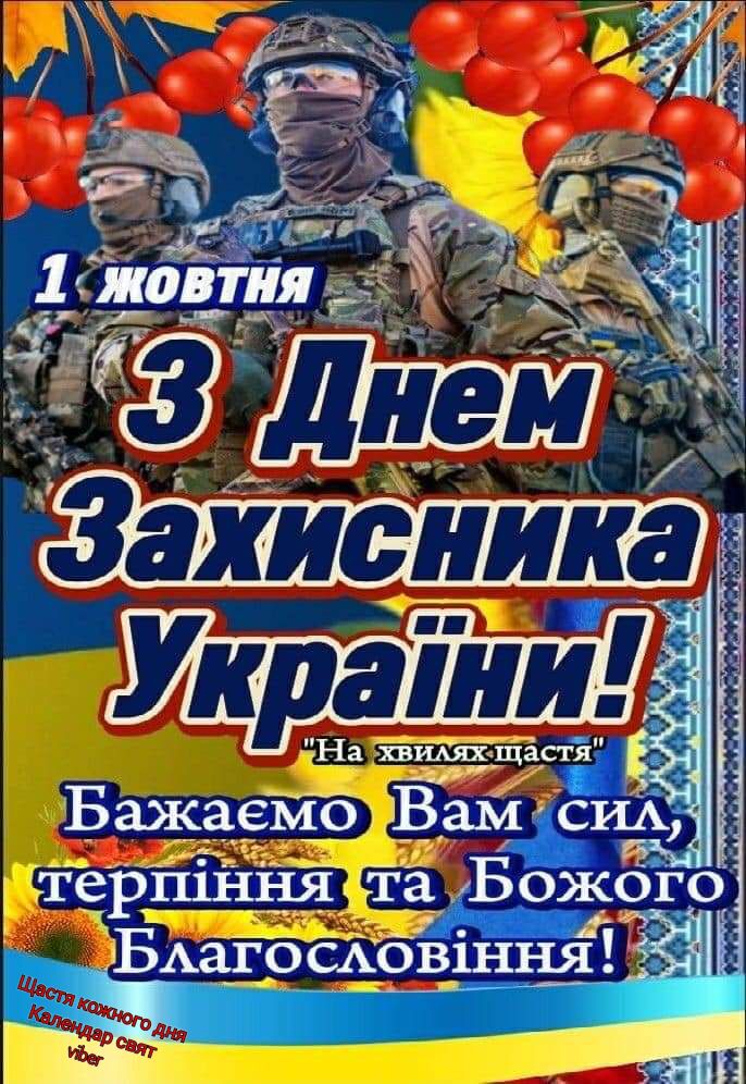 1 жовтня наша країна відзначає державне свято - День захисника України! Щиро вітаємо наших захисників територіальної цілісності та суверенітету України та усіх тих, хто всіляко підтримує нашу країну в цій боротьбі! Сьогодні в усьому світі Україна є символом незламності, сили духу, наполегливої боротьби за свободу і суверерітет! Слава Україні! Слава Збройним силам України! Слава нашим героям!