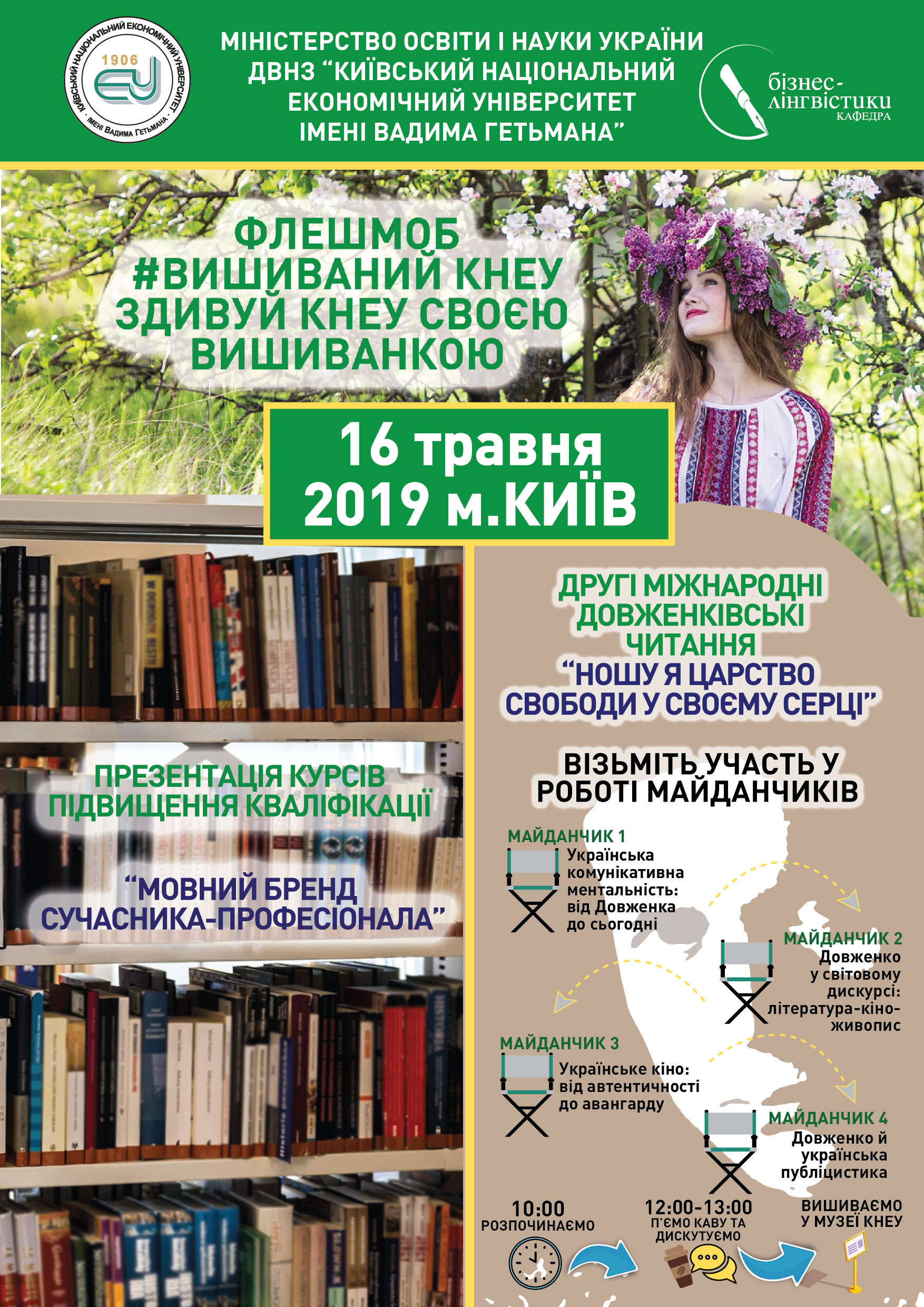 Запрошуємо всіх охочих до участі у ДРУГИХ МІЖНАРОДНИХ ДОВЖЕНКІВСЬКИХ ЧИТАННЯХ «Ношу я царство свободи у своєму серці», які відбудуться 16 травня 2019 р. о 10:00 в актовій залі КНЕУ.