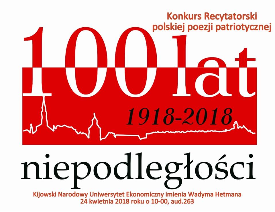 24 квітня 2018 р. о 10.00 в Київському національному економічному університеті імені Вадима Гетьмана відбудеться фінальний етап міського Конкурсу декламації патріотичних віршів польською мовою, присвячений 100-річчю Незалежності Польщі (ауд. 263, 1 корпус). У конкурсі братимуть участь фіналісти попередніх етапів: учні Польської Суботньої Школи м. Києва, представники молодіжних польських організацій Києва, студенти КНЕУ, які вивчають польську мову. Запрошуємо всіх охочих відвідати захід і послухати польську патріотичну поезію.