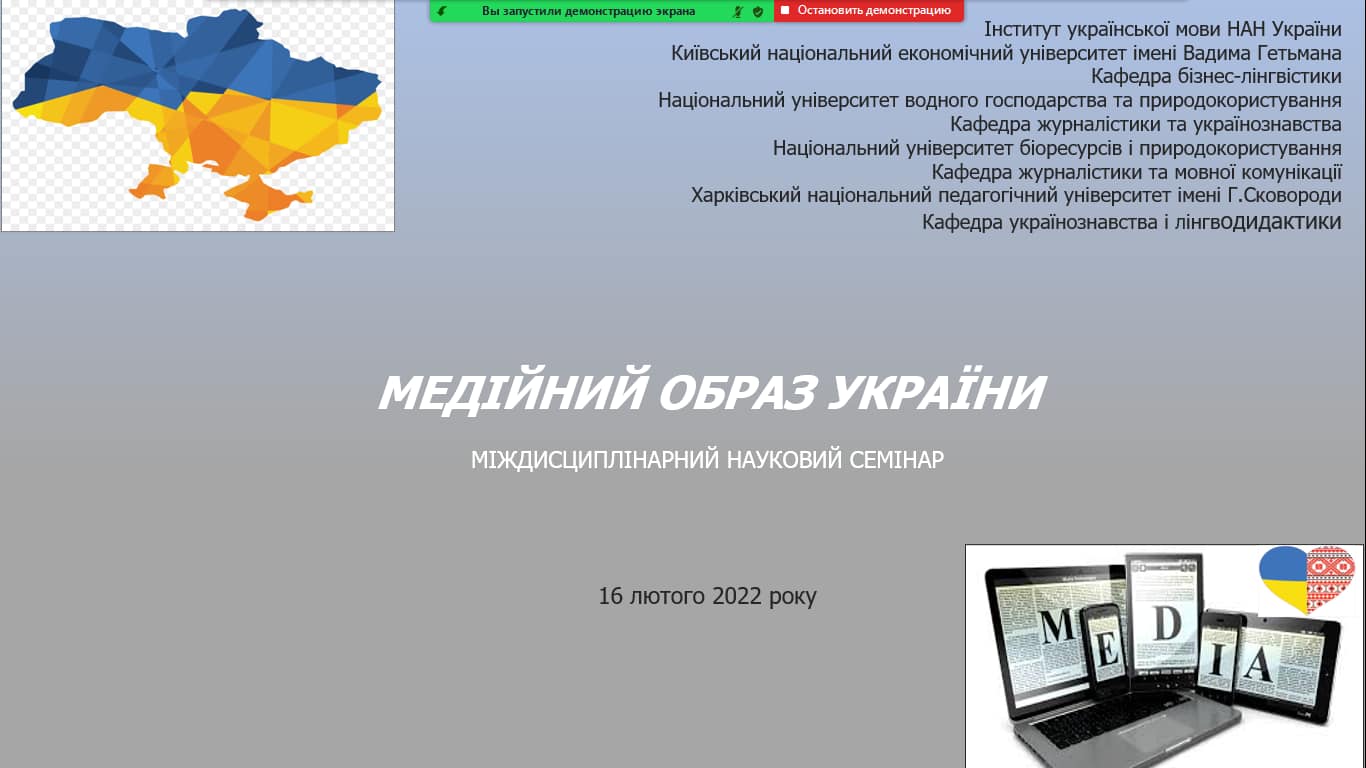 16 лютого 2022 року члени кафедри взяли активну участь у міждисциплінарному науковому семінарі "МЕДІЙНИЙ ОБРАЗ УКРАЇНИ". Своїми думками з аудиторією поділилися доповідачки Марина Навальна (Київ) ("Від традиційних до нових українських медіа: особливості функціонування"), Лариса Кравець (Берегово) ("Інтерпретація образу України міжнародними ЗМІ («Німецька хвиля» і «Радіо Свобода»), Майя Дзюба (Рівне) ("Образ Рівненщини в текстах ЗМІ як реальна когнітивна модель"), Олена Маленко (Харків) ("Соціолінгвістичний імідж України в медіадискурсі: своє проти чужого").