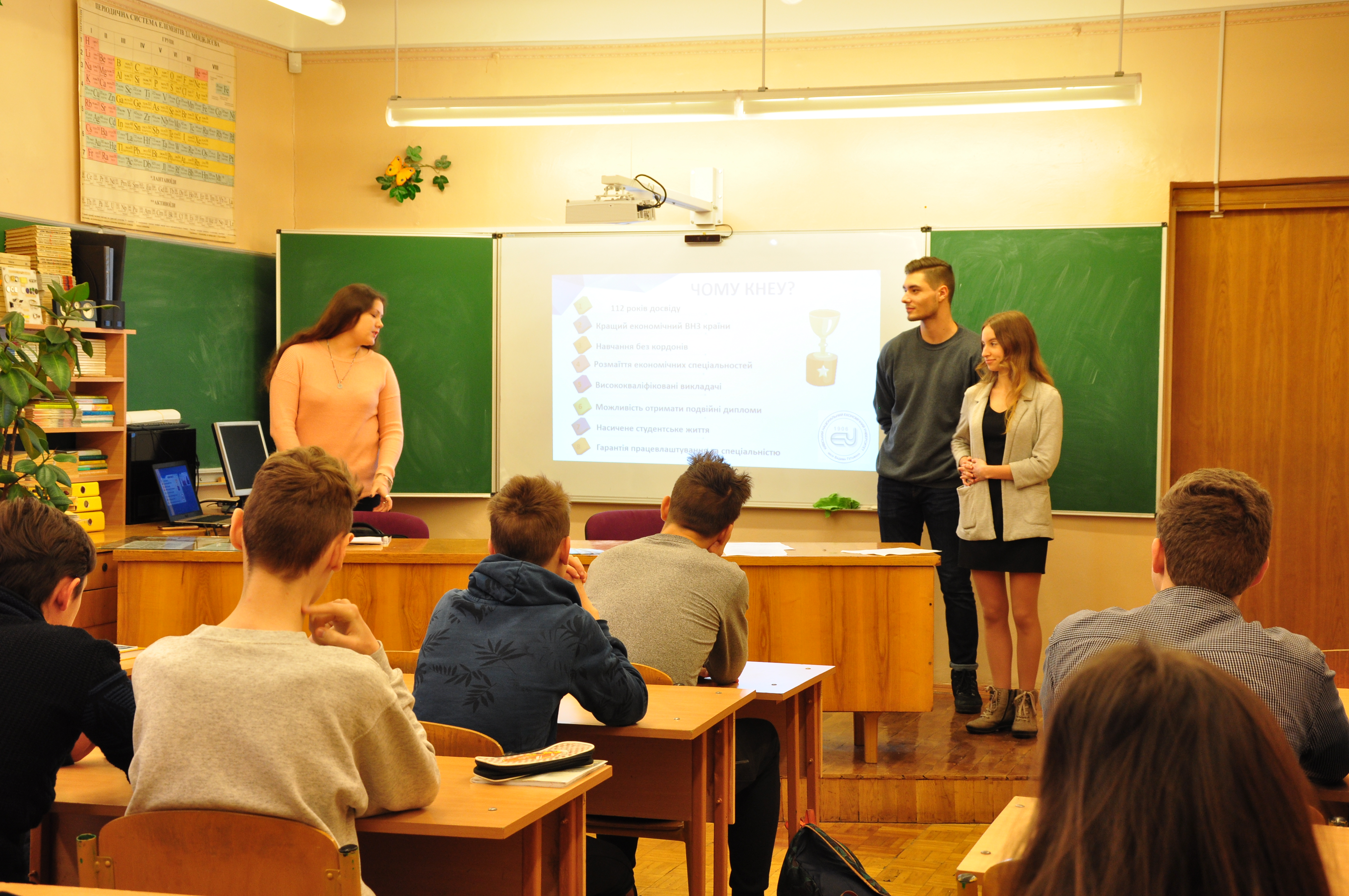 Запрацював новий студентський проект05 Грудня 2018р.4 та 5 грудня 2018 року студенти 2 курсу факультету МЕіМ успішно провели виїзні презентації у школі І - ІІІ ступенів №225 та спеціалізованій школі № 80 м. Києва, розповіли учням 10 - 11 класів про переваги навчання у ДВНЗ "КНЕУ ім. В.Гетьмана", а також запросили учнів та їхніх батьків на Дні відкритих дверей, що відбудуться 8 грудня 2018 р. та 9 лютого 2019 р., аби детальніше ознайомитися з умовами вступу до університету. |