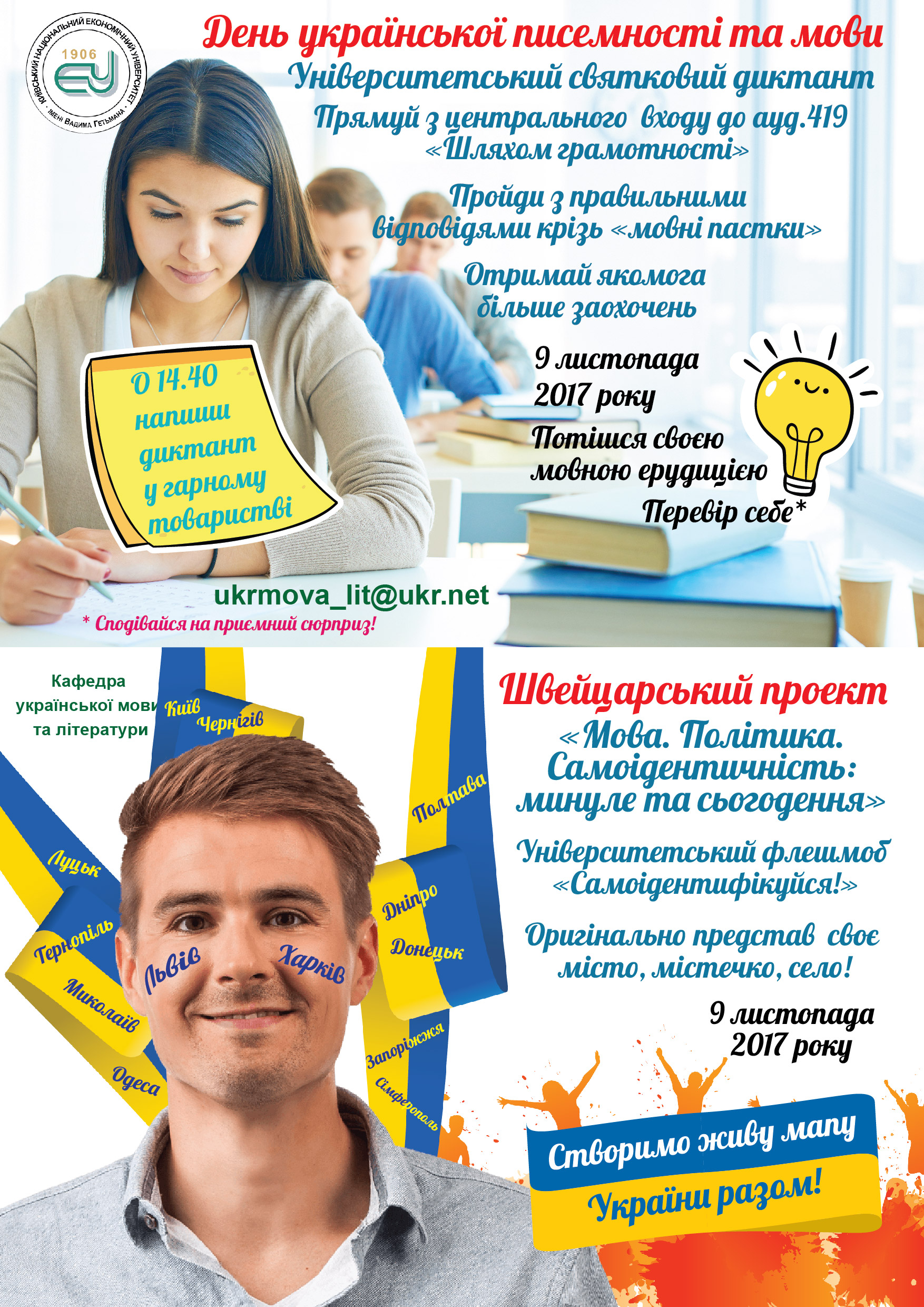 9 листопада 2017 р. стартує Швейцарський проект "Мова. Політика. Самоідентичність: минуле та сьогодення" та університетський флешмоб "Самоідентифікуйся!" Створімо живу мапу України разом! А також о 14.40 в ауд. 419 запрошуємо взяти участь у написанні диктанту національної єдності.