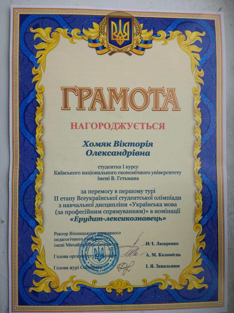 Радо вітаємо також ще одного представника студентства КНЕУ з перемогою в І турі ІІ етапу Всеукраїнської студентської олімпіади ("Українська мова (за професійним спрямуванням)" в номінації "Ерудит-лексикознавець") - Хомяк Вікторію Олександрівну (1 курс МЕіМ, 5 гр.,спеціальність "Міжнародна економіка"). Бажаємо подальших наукових звершень!